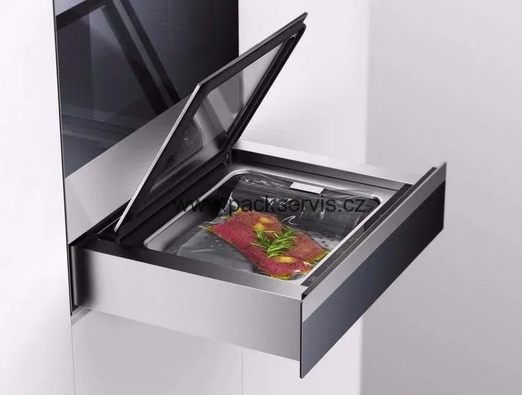 Vestavná komorová vakuová balička do kuchyňské linky. Možnost používat hladké vakuové sáčky ( standardní, sous-vide, silné na kosti, smrštitelné) Automatický servisní program údržby vakuového čerpadla, digitální ovládání s časovým řízením jednotlivých kroků.