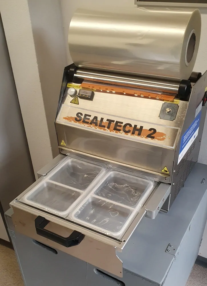 Po zasunutí misek do stroje balička automaticky provede zatavení krycí folie na misku, bez vakua, bez ochranné atmosféry.